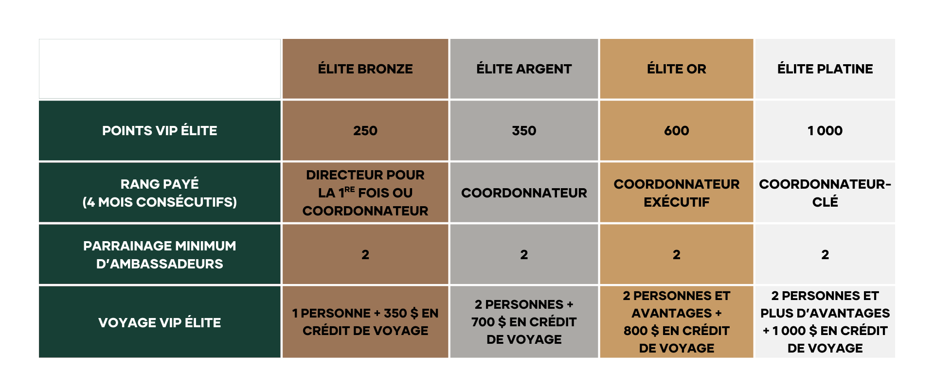 - Les exigences de rang pour Élite Argent, Or et Platine sont plus élevées pour correspondre au développement du leadership